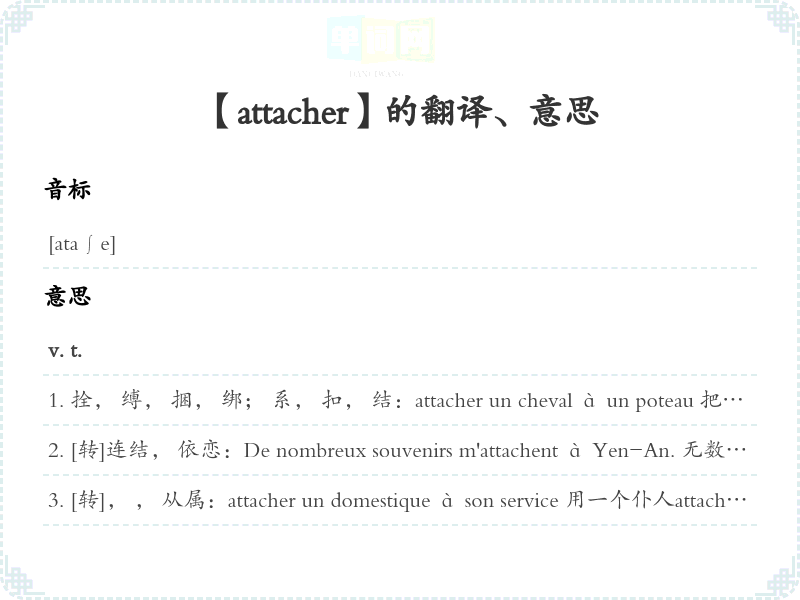 [转]赋予, 给予:attacher de l'importance aux méthodes de travail 重视工作方法attacher un sens à un mot 赋予一词以一词义