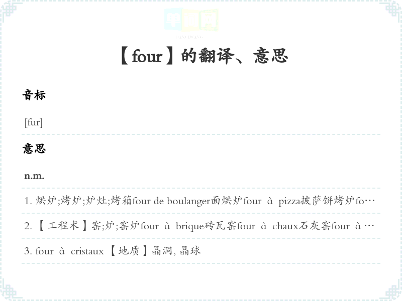 烘炉;烤炉;炉灶;烤箱four de boulanger面烘炉four à pizza披萨饼烤炉four à micro-ondes微波炉four muni d'un tournebroche有转动铁扦的烤炉four à gaz煤气灶four électrique电炉four à pyrolyse自洁式炉bouche [gueule] d'un four 炉口, 灶口mettre un gâteau au four 把蛋糕放入烤炉ouvrir la bouche comme un four , 〈引申义〉 ouvrir un grand four 张开大口On ne peut être à la fois au four et au moulin.〈谚语〉一个人不能同时做两件事。一个人不能同时在两处地方。faire un four 〈转义〉失败, 受挫, 不成功 [多指演出或作品]La représentation a été un four complet [noir].〈引申义〉演出完全失败了。pièce de four 糕点petits fours小蛋糕, 花式糕点rôti cuit au four 在烘炉里烤的肉