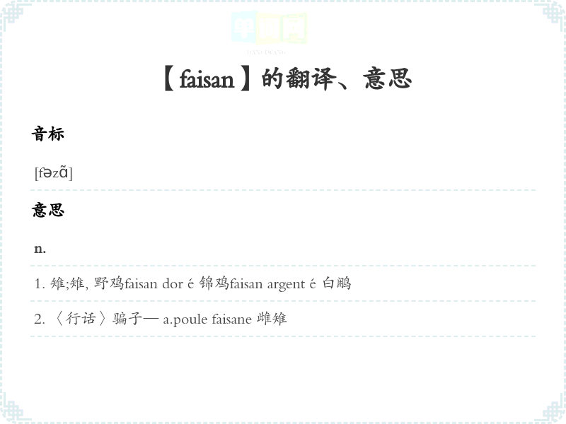 雉;雉, 野鸡faisan doré锦鸡faisan argenté白鹇