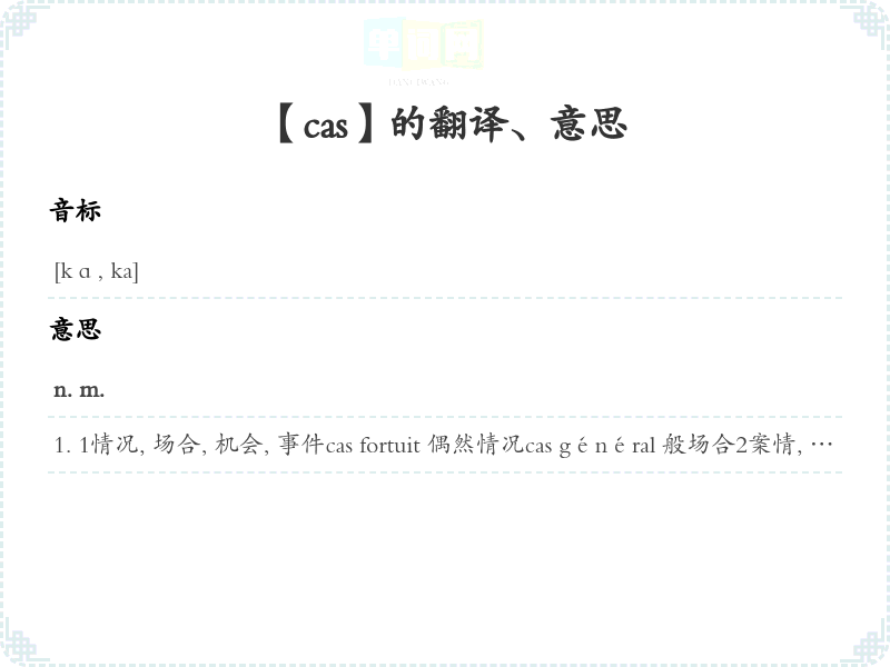 1情况, 场合, 机会, 事件cas fortuit 偶然情况cas général 般场合2案情, 案件, 处境, 境况3病例, 病情, 病人4性格、众同的人, 性格突的人5 [语]格