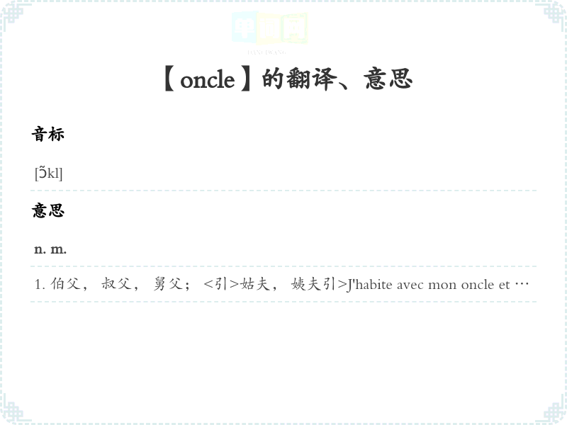 伯父, 叔父, 舅父; <引>姑夫, 姨夫引>J'habite avec mon oncle et ma tante à Marseille.我和我的叔叔婶婶住在马赛。"Mon oncle Jules" est le chef-d'oeuvre de Maupassant.《我的叔叔于勒》莫泊桑的代表作。