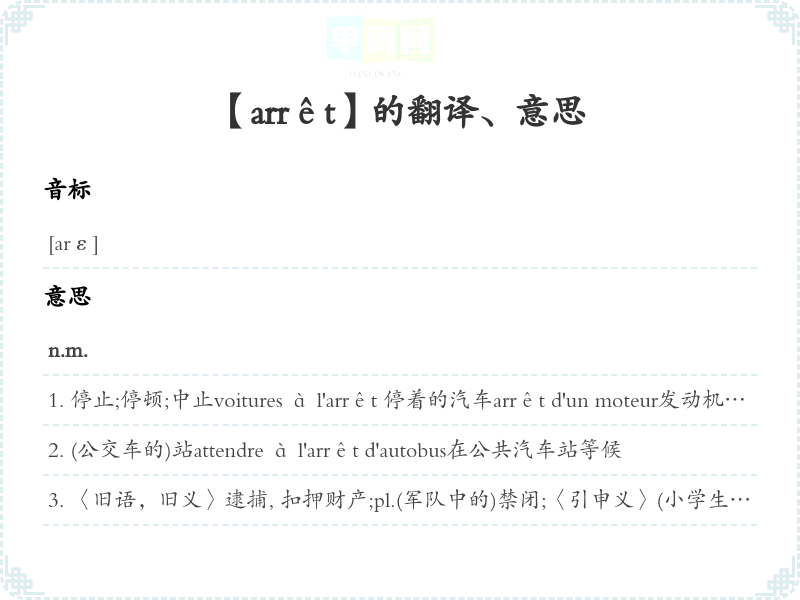 停止;停顿;中止voitures à l'arrêt 停着的汽车arrêt d'un moteur发动机的停转arrêt du cœur心脏停搏arrêt du [de] travail[因病假、罢工、失业等原因] 停工arrêt des affaires商业的停滞arrêt des hostilités敌对行为的中止coup d'arrêt 突然停止être [tomber] en arrêt (在件事物面前)惊奇得停下来Nous ferons quelques arrêts au cours de notre voyage.我们在旅行期几次停留。sans arrêt 不断地, 不停地temps d'arrêt 歇d'arrêt 阻止的, 拦断的