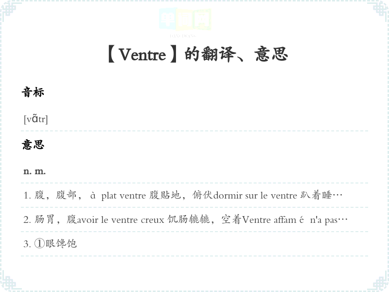 【Ventre】 联想:、 形容词变化:、 近词:、 词: 联想词