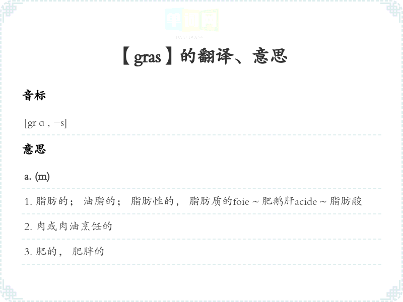 【gras】 联想:、 阴性变化:、 副词变化:、 近义词:、 反义词: 联想词