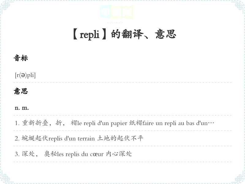 replis n. m. pl. 折痕,波褶;【解】(肠,腹膜等的)襞les replis de la peau 皮肤的纹