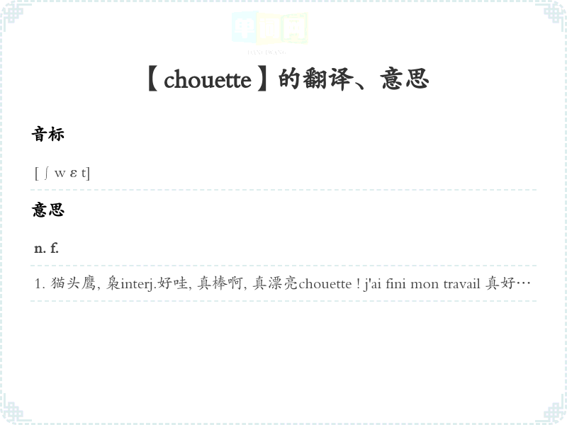 猫头鹰, 枭interj.好哇, 真棒啊, 真漂亮chouette ! j'ai fini mon travail 真好啊,我总算把工作干完了a.<口> 1漂亮, 好看, un type chouette 一个漂亮家伙il fait un chouette temps 今天天气真好2客气; 和气ll a été chouette avec nous 他对我们友好大方3舒适, 愉快常见用法machin (chouette)那人le cri de la chouette猫头鹰叫声 法 语 助 手口>