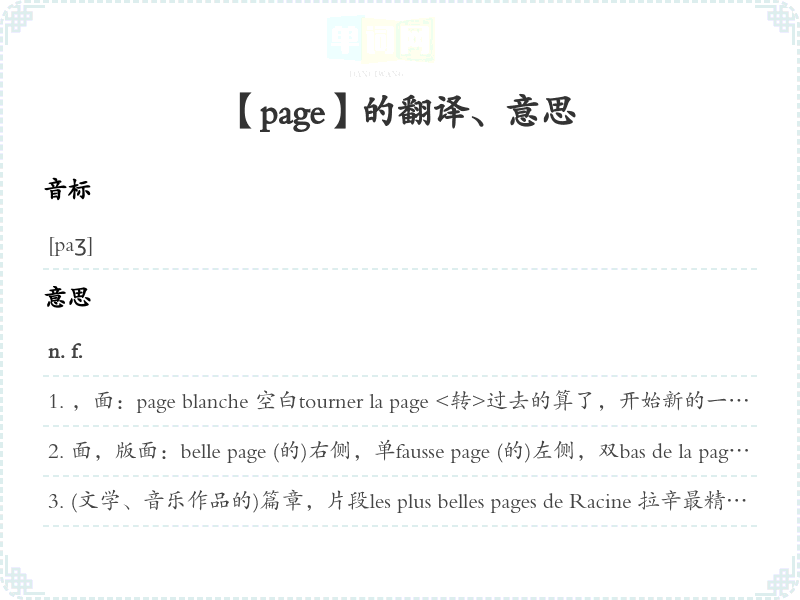 ,面:page blanche 空白tourner la page <转>过去的算了,开始新的一pages de publicité à la télévision <引>电视广告引>转>