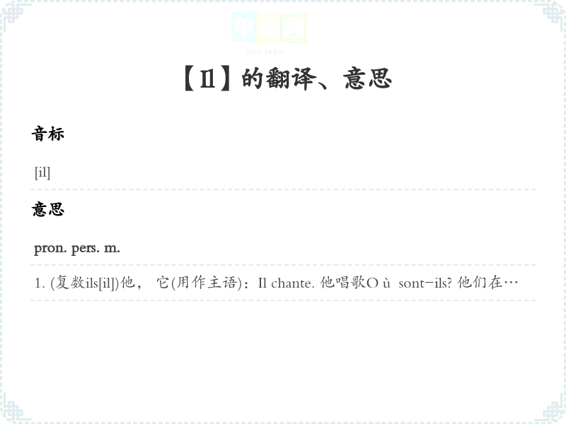 (复数ils[il])他, 它(用作主语):Il chante. 他唱歌Où sont-ils? 他们在什么地方?pron. neut.(用作无人称动词或无人称动词短语的主语):Il fait froid. 天气冷. Il pleut des balles. 子弹像点般落来.