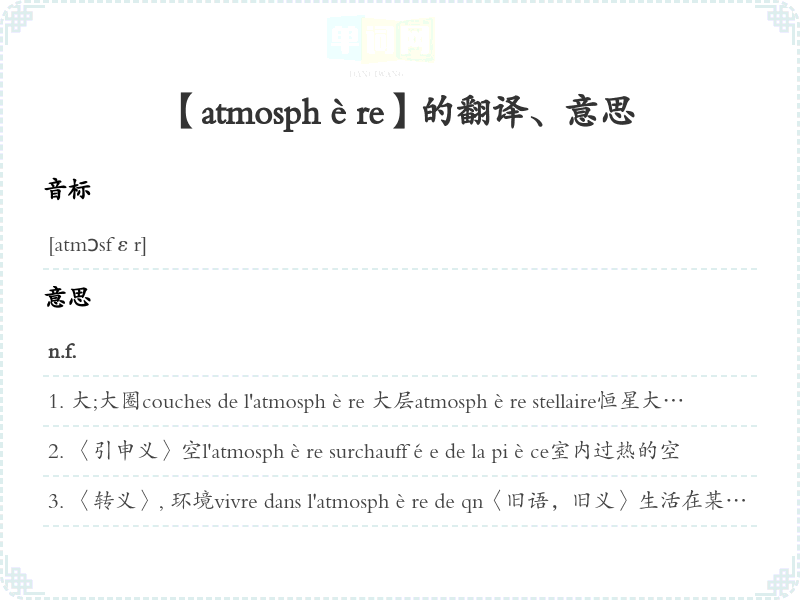 〈转义〉, 环境vivre dans l'atmosphère de qn〈旧语,旧义〉生活在某人身边atmosphère de paix和平的une atmosphère de vacances度假的changer d'atmosphère 〈口语〉改换环境