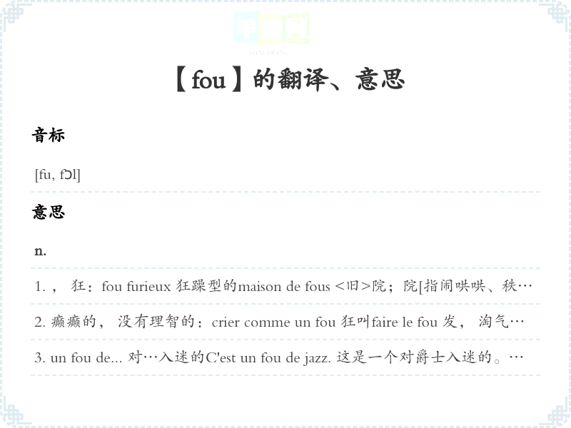 失去理智的,愚蠢的, 傻的fou de joie 欣喜若狂un fol espoir 失去理智的希望être fou de... 发般地爱上…,狂热地迷恋…,对…入迷Il est un peu fou. 这个有点不正常,有点怪。