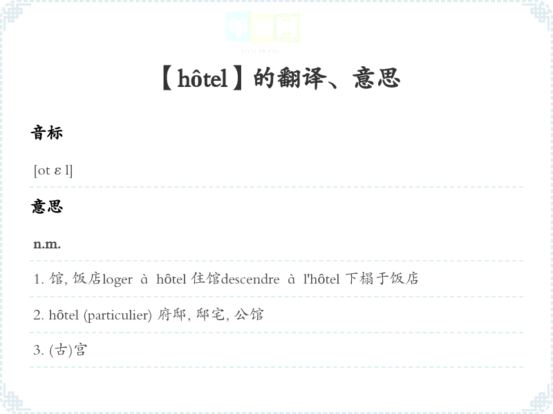 【hôtel】 联想:、 名词变化:、 形容词变化:、 近义词: 联想词