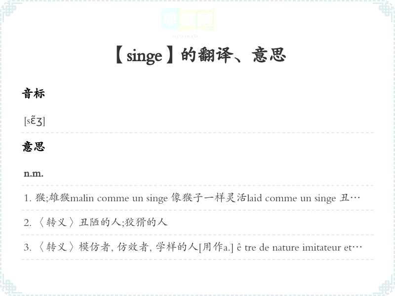 猴;雄猴malin comme un singe 像猴子一样灵活laid comme un singe 丑陋不堪payer en monnaie de singe 〈转义〉用空话敷衍债主;用空话报答On n'apprend pas à un vieux singe à faire la grimace.〈谚语〉用不到教老猴扮鬼脸。 [喻不必多此一举]