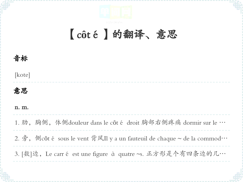 【côté】 联想、 名词变化:、 义词、 反义词、 、词 联想词