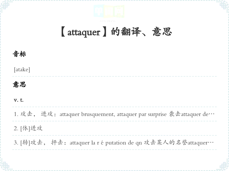 攻击, 进攻:attaquer brusquement, attaquer par surprise 袭击attaquer de toutes parts 从进攻, 围攻attaquer qn à coups de bâton 用棍棒攻击某人A l'aube, nous attaquâmes l'ennemi. 拂晓, 我们向敌人发起了进攻。