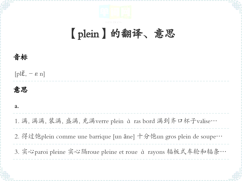 loc.prép.许多, 很多Il y a plein de monde dans la rue. 街上全是人。adv.sonner plein (实心物体被叩击时)发出实声 / tout plein 〈口语〉非常, 很Vous êtes gentil tout plein. 您实在太好了。n.m.