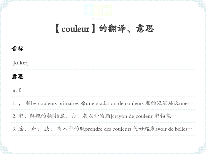 【couleur】 联想:、 近义词:、 反义词: 联想词