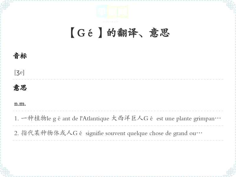 【Gé】 助记:、 词根:、 联想、 名词化:、 词化:、 形容词化:、 近义词、 反义词、 同音、近音词 联想词