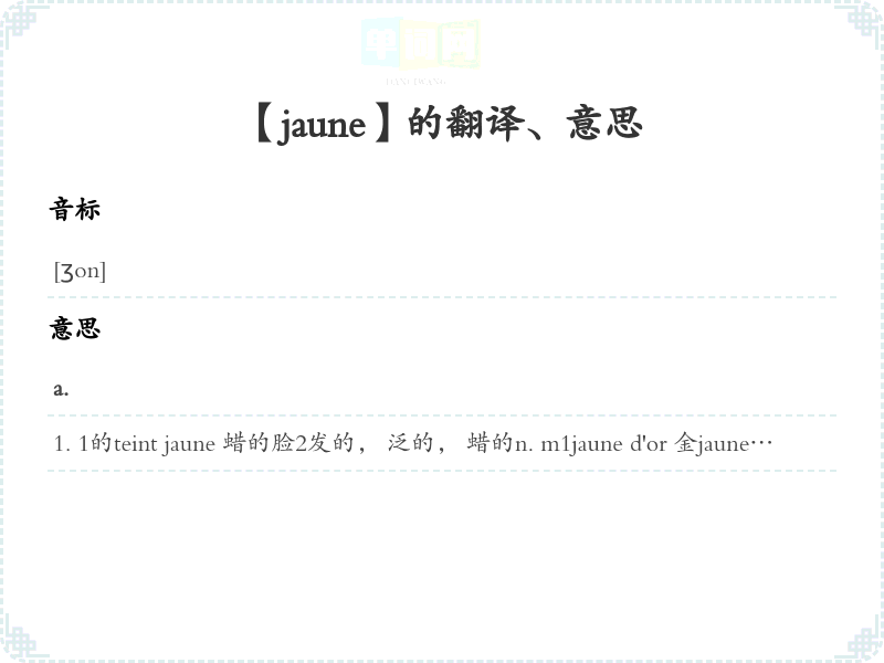 1的teint jaune 蜡的脸2发的, 泛的, 蜡的n. m1jaune d'or 金jaune d'ambre 琥珀2, 颜jaunes minéraux 矿物质3<集>衣服4(物体的)部分5种人6工会会员; 罢工破坏者集>adv.1为难地; 勉强地; 发地2 rire~苦笑, 强笑