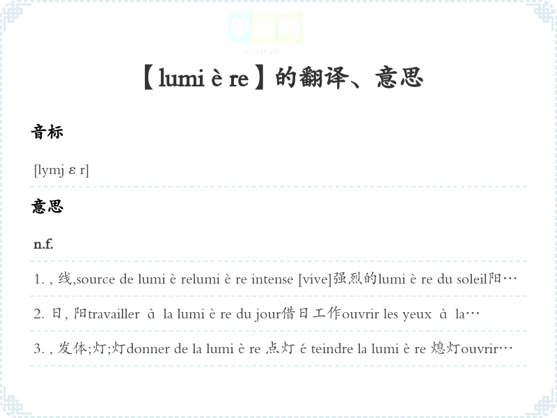 【lumière】 助记:、 词根:、 联想:、 名词变化:、 形容词变化:、 副词变化:、 近义词:、 反义词: 联想词