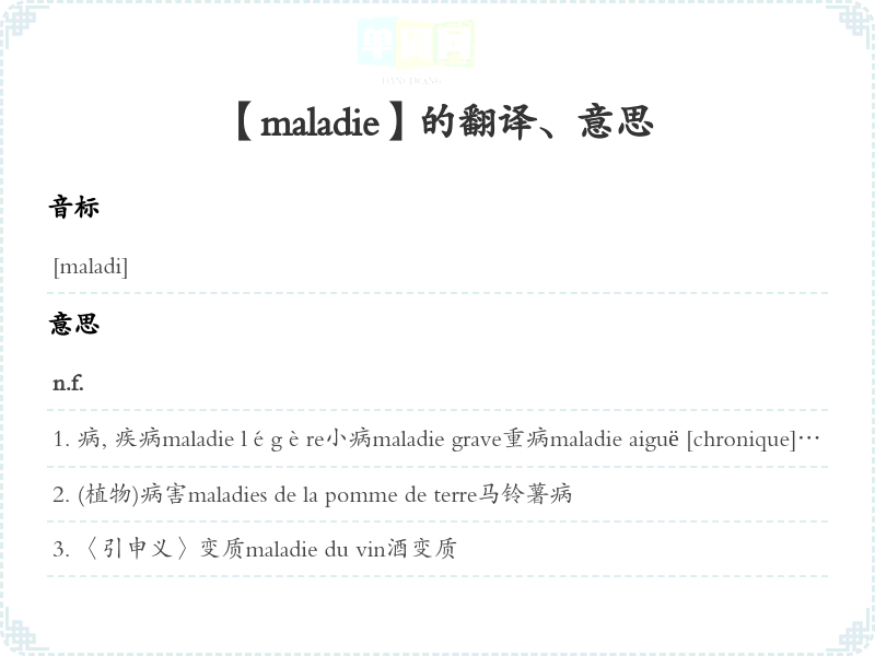 病, 疾病maladie légère小病maladie grave重病maladie aiguë [chronique]急性 [慢性] 疾病maladie épidémique流行病maladie mentale精神病maladie professionnelle职业病maladie de foie肝病maladie bleue发绀病maladie (des jeunes chiens)犬瘟热maladie de la vache folle疯牛病maladie sexuellement transmissible性病 [缩写为M. S. T.]les frais de maladie 医费assurance-maladie 医être en congé de maladie 正在病假期间maladie diplomatique(为逃避义务等而)假装生病attraper [contracter] une maladie 得病en faire une maladie 〈口语〉感到难, 感到苦恼