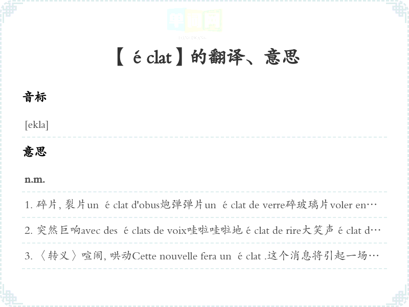 突然巨响avec des éclats de voix哇啦哇啦地éclat de rire大笑声éclat de tonnerre雷鸣rire aux éclats哈哈大笑