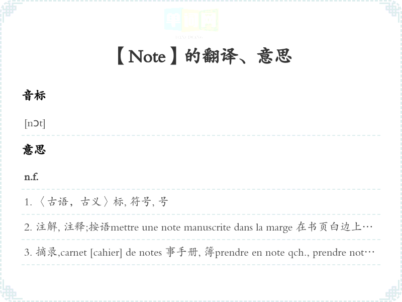 摘录,carnet [cahier] de notes 事手册, 簿prendre en note qch., prendre note de qch. 把某事下来prendre bonne note d'une chose 牢一事prendre des notes pendant un discours 在听报告时做Voici quelques notes sur la question. 以下就是关于这个问题的一些摘录。étudiants qui se prêtent leurs notes 互借的学生orateur qui parle sans notes 讲话用讲稿的演说者