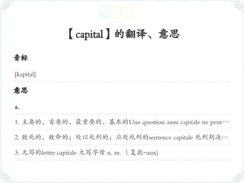 主要的,首要的,最重要的,基本的Une question aussi capitale ne peut pas être traitée à la légère.如此重要的问题不能轻率处理。 point capital 要点ville capitale〈旧语,旧义〉首都, 首府jouer un rôle capital 起主要作用