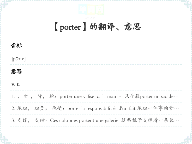 穿戴, 佩带:porter un insigne 佩带徽章[转]:porter les armes 当兵porter la robe 当法官porter la soutane 当教士porter un nom illustre 出身名门Il n'est pas bien porté de … …是不文雅的; …是不合礼仪的。1