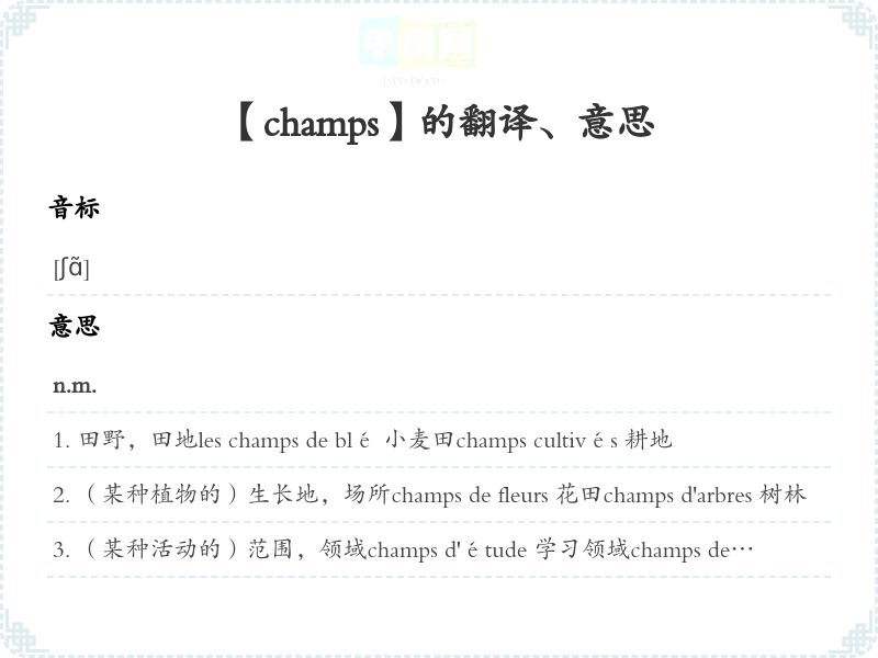 (某种植物的)生长地,场所champs de fleurs 花田champs d'arbres 树林