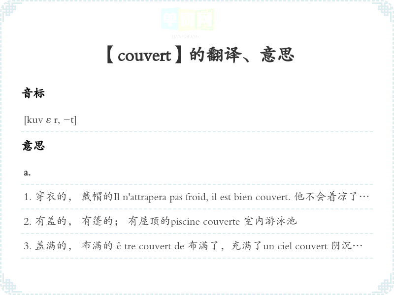 (供一人使的)一副餐具couvert d'argent 银餐具une table de douze couverts 摆12副餐具的餐桌lave-vaisselle de douze couverts 一打餐具容量的洗碟机retenir deux couverts au restaurant 在饭店预订两个座avoir toujours son couvert mis chez qn 某家餐桌上的常客 [喻与某家关系亲]à couvert deprép. [短语]在避开…的地方à couvertadv. [短语]在掩蔽处; <转>在安全处, 有保障转>sous le couvert deprép. [短语]在…承担责任的情况下, 在…担保下; 在…名义下sous couvert deprép. [短语]由(某人)转[于通讯地址]