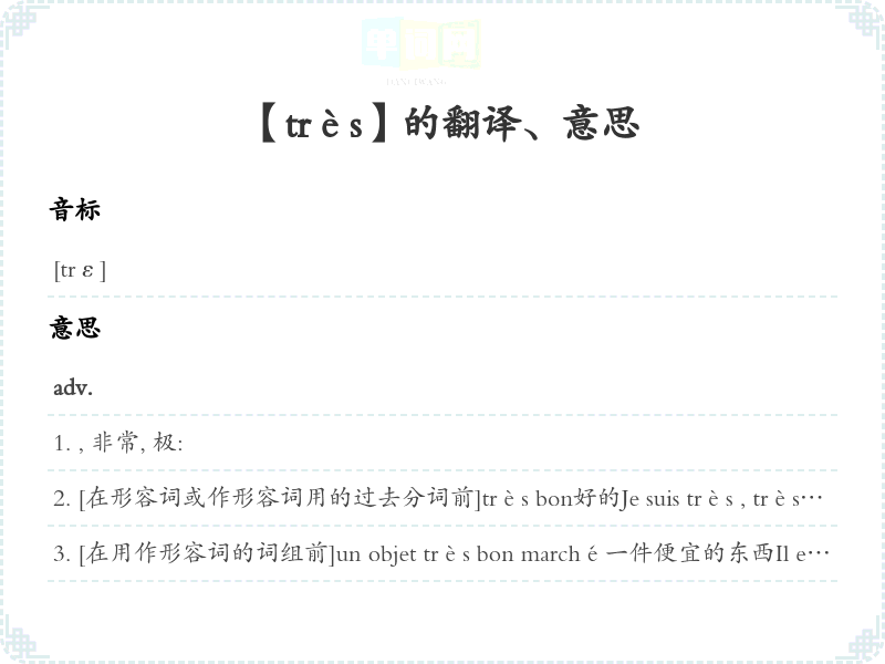 [在形容词或作形容词用的过去分词前]très bon好的Je suis très , très content.〈口语〉我非常非常高兴。C'est très clair.这清楚。un homme très estimé一个非常受人尊敬的人Cette question est très embarrassante.这个问题令人尴尬。