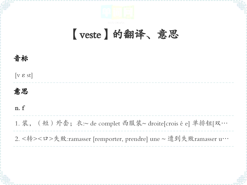 【veste】 派生:、 名词化:、 形容词化:、 近义词:、 反义词: 联想词