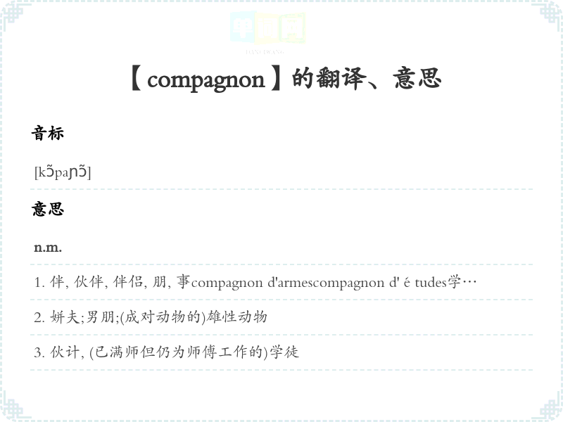 【compagnon】 助记:、 近义词:、 反义词: 联想词