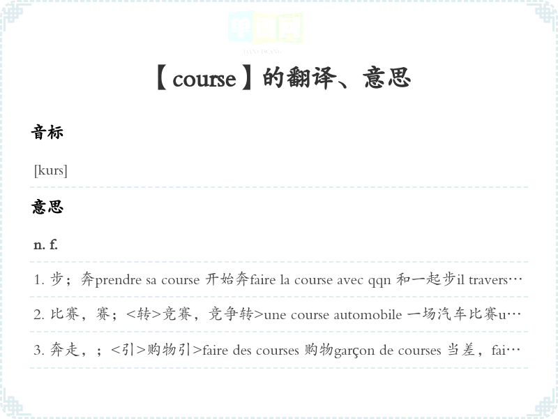 步;奔prendre sa course 开始奔faire la course avec qqn 和一起步il traverse le jardin au pas de course 他步穿过花园
