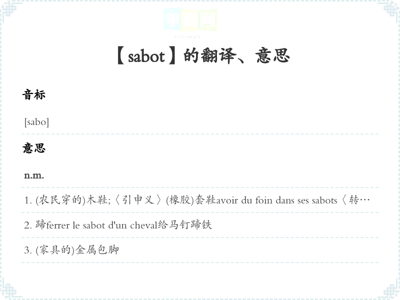 (农民穿的)木鞋;〈引申义〉(橡胶)套鞋avoir du foin dans ses sabots〈转义〉很有钱Je le vois [l'entends] venir avec ses gros sabots.我眼就看穿他的用意。