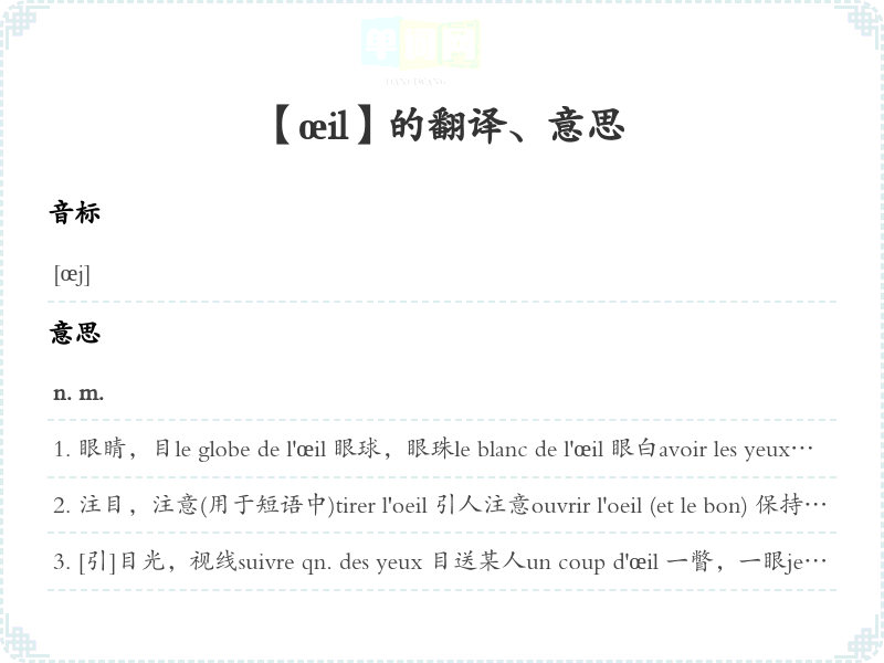 注目,注意(用于短语中)tirer l'oeil 引人注意ouvrir l'oeil (et le bon) 保持谨慎