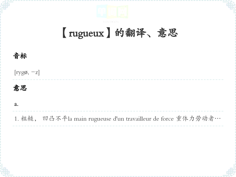 粗糙, 凹凸不平la main rugueuse d'un travailleur de force 重体力劳动者粗糙手m.[军]拉火管, 拉火线