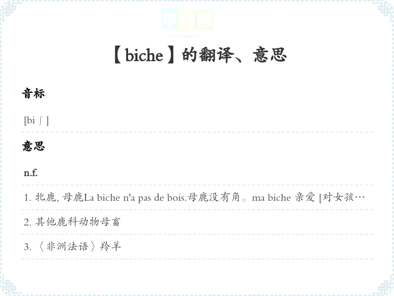 牝鹿, 母鹿La biche n'a pas de bois.母鹿没有角。ma biche 亲爱 [对女孩和年轻妇女爱]meuble à pieds de biche 家具ventre de biche 淡赭色