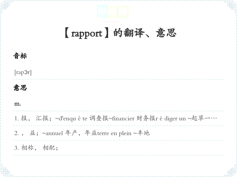 报, 汇报;~d'enquête 调查报~financier 财务报rédiger un ~起草一份报rapport confidentiel 秘密报