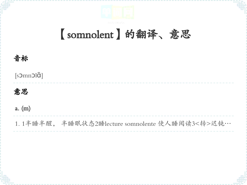 【somnolent】 助记:、 派生:、 近义词、 反义词、 同音、近音词 联想词
