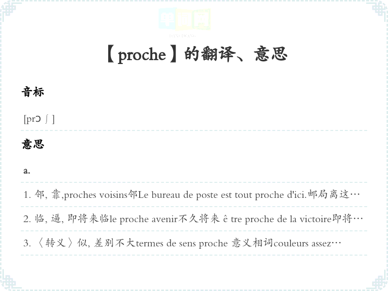 亲属或血缘关系proche parent亲mammifères proches des singes跟猿猴相哺乳动物— n.m.pl.亲— adv.〈旧语,旧义〉相, 附Il demeure ici proche .他就住在附。— prép.〈旧语,旧义〉在…附de proche en procheloc.adv.渐渐, 逐步