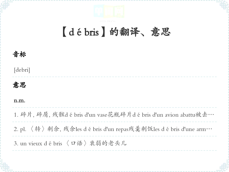 pl. 〈转〉剩余, 残余les débris d'un repas残羹剩饭les débris d'une armée残军les débris d'une fortune剩余的财产