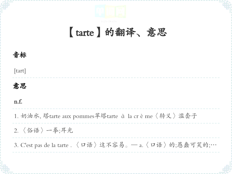 C'est pas de la tarte . 〈口语〉这不容易。— a.〈口语〉的;愚蠢可笑的;蹩脚的