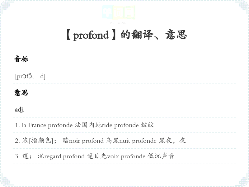 【profond】 助记:、 词根:、 生:、 联想:、 名词变化:、 形容词变化:、 近义词:、 反义词: 联想词
