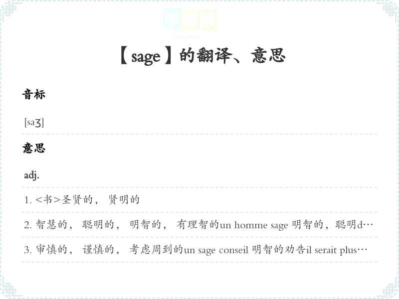 【sage】 派生:、 近义词:、 反义词: 联想词