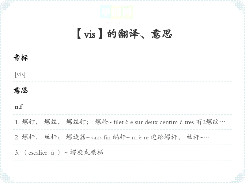 螺钉, 螺丝, 螺丝钉; 螺栓~ filetée sur deux centimètres 有2螺纹的螺钉pas de ~ 螺距~ à bois 木螺钉, 木螺丝~ à tête ronde [plate] 圆[平]头螺钉~ à papillon [à ailettes] 翼型螺丝, 元宝螺丝~ de rappel 微动螺钉, 调整螺钉~ Parker 自攻螺钉[商品名]serrer la ~ à qn <转>严厉地对待某人donner un tour de ~ 把螺丝拧紧一圈转>