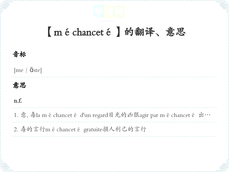 意, 毒la méchanceté d'un regard目光的凶狠agir par méchanceté 出于意行事Il l'a fait sans méchanceté .他做这事意。