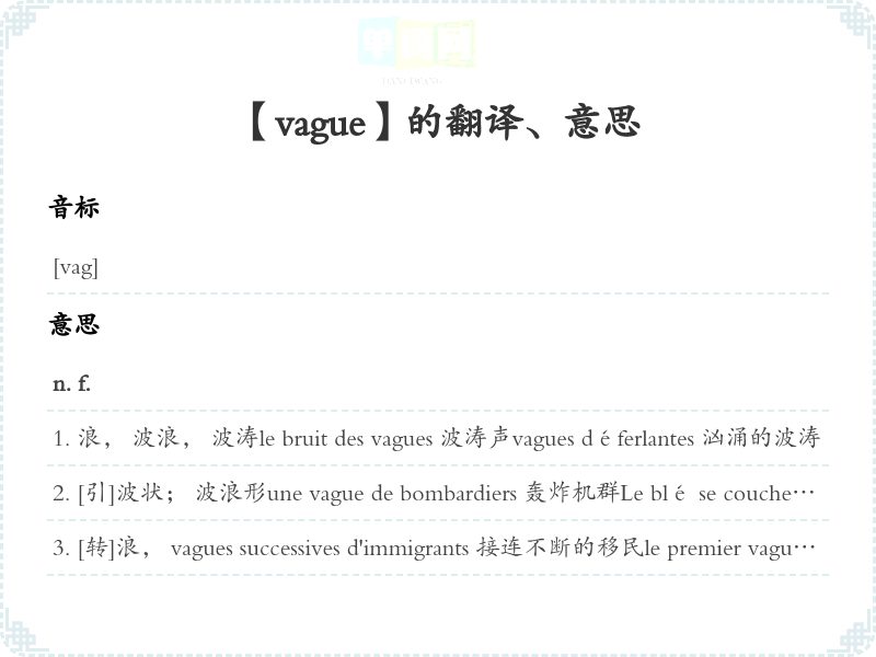 大批,大量[指一起移动的人或]vague de touristes 大批游客Une première vague de départs a eu lieu samedi. 第一批出发在星期六。n. m.
