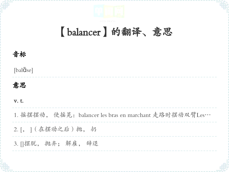 摇摆摆动, 使摇晃:balancer les bras en marchant 走路时摆动双臂Les vagues balancent les navires à l'ancre. 波涛把抛锚的船只冲得摇晃不。