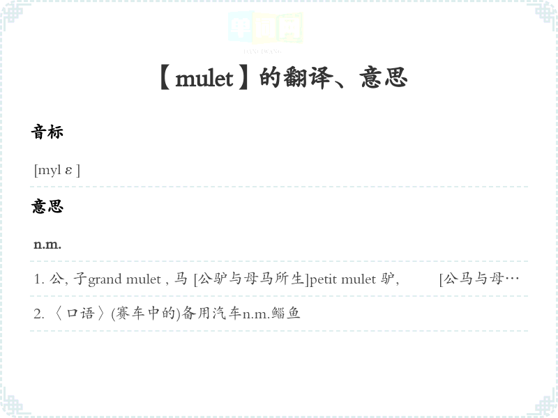 公, 子grand mulet , 马 [公驴与母马所生]petit mulet 驴, [公马与母驴所生]chargé comme un mulet 〈口语〉像子一样扛着很重的东西
